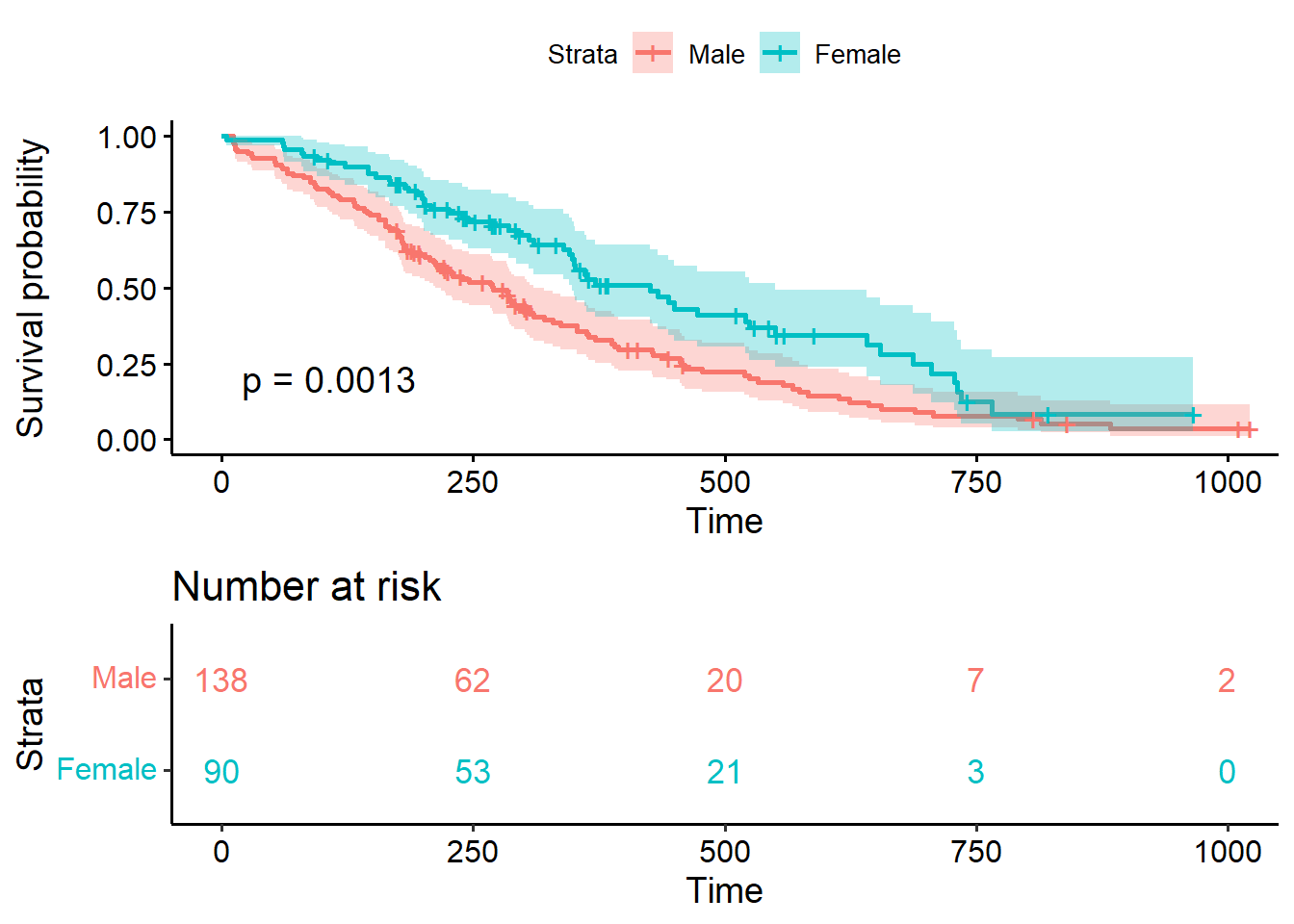 ggsurvplot(lung_sex,conf.int = T,pval=T,risk.table = T,risk.table.col="sex", legend.labs=c("Male","Female"),risk.table.height = 0.4)