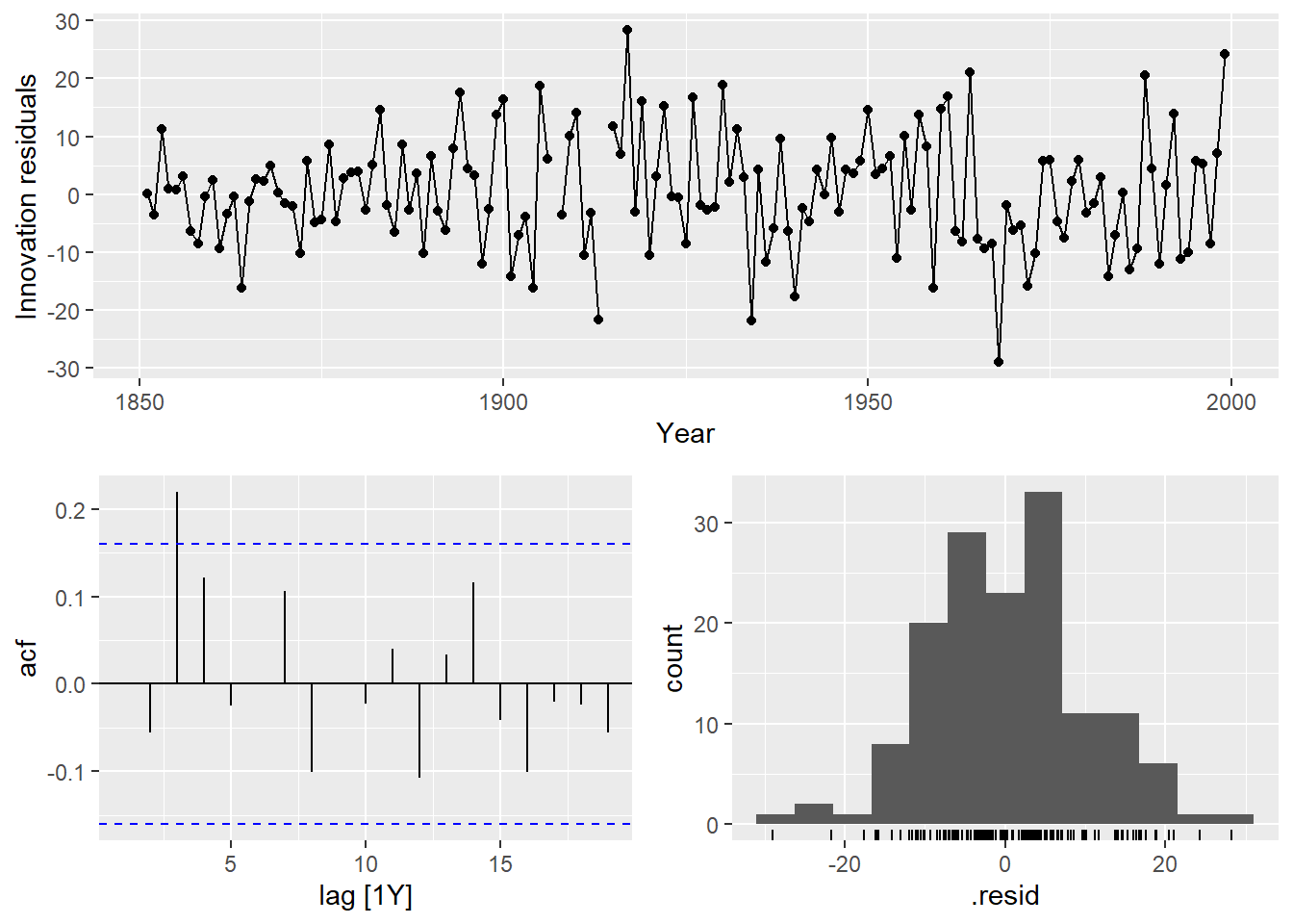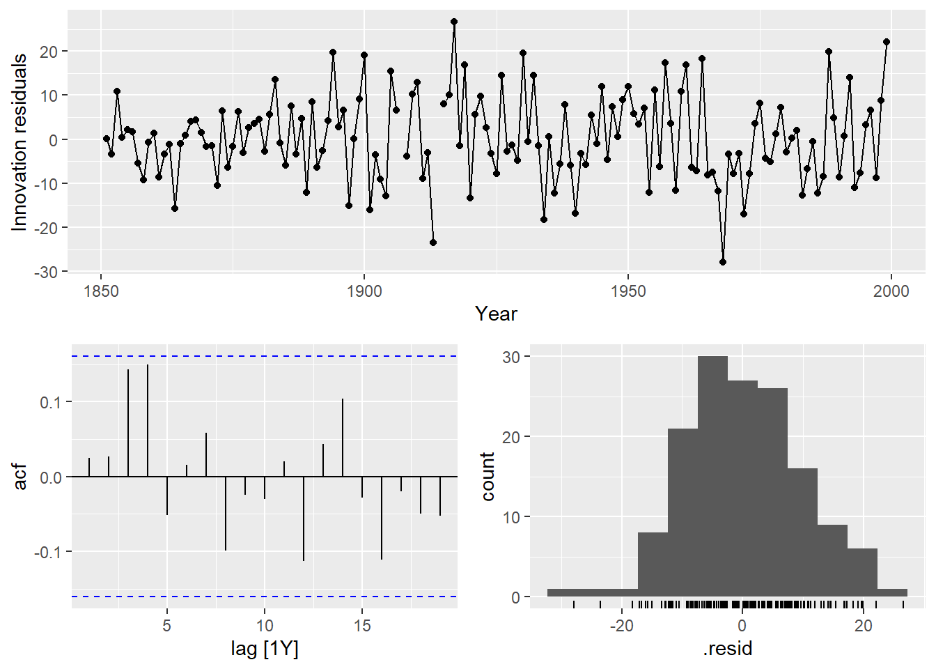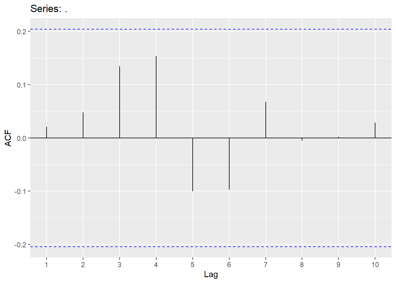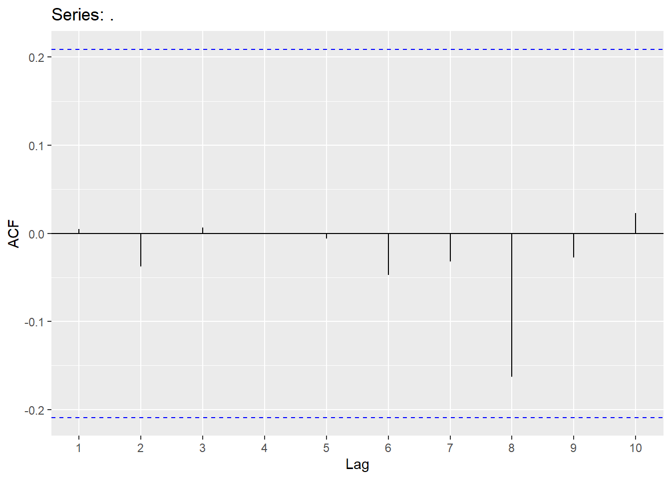 augment(Y.ARIMA) %>% features(.innov,ljung_box, lag=10, dof = 2)## # A tibble: 1 × 3
