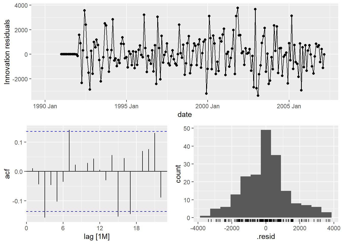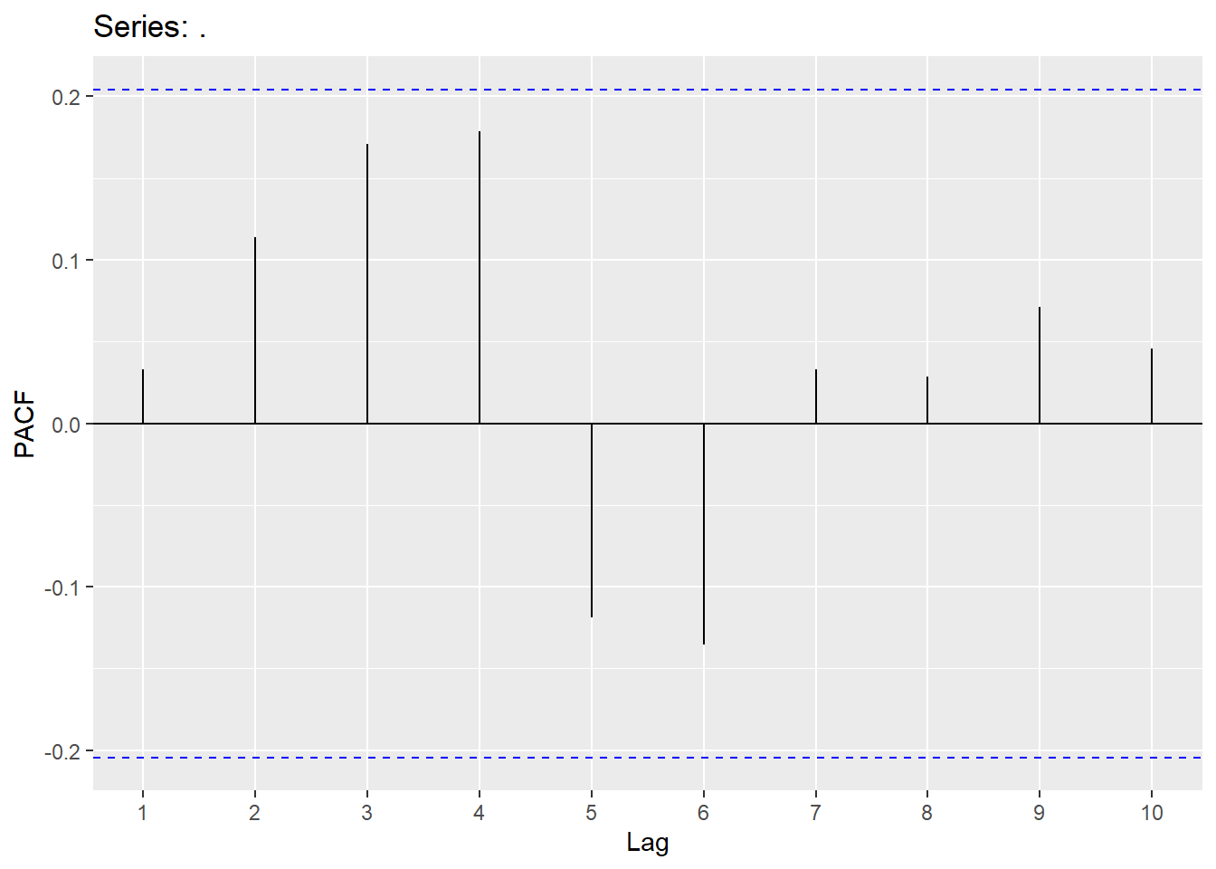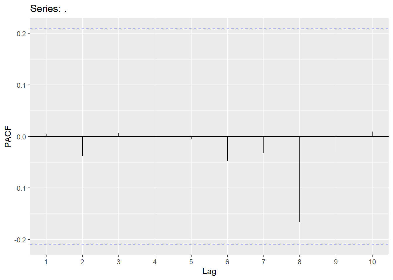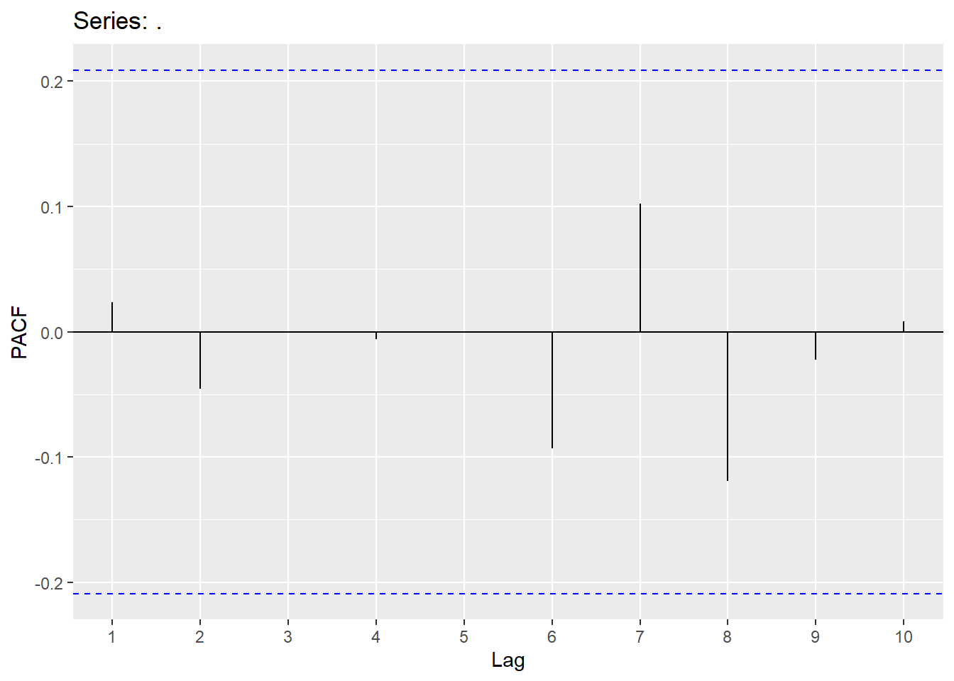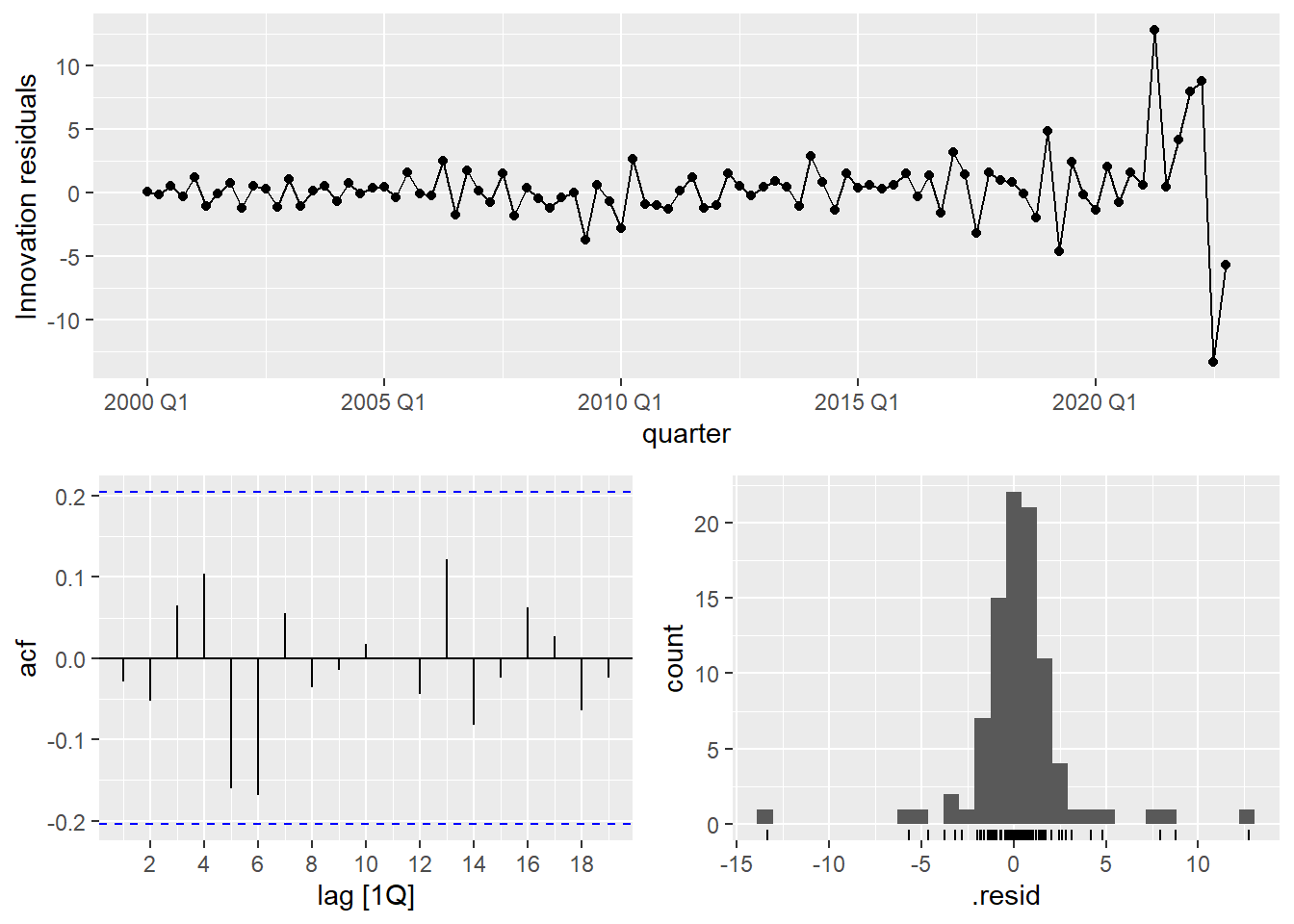 augment(Y.ARIMA) %>% features(.innov,ljung_box, lag=10, dof = 2)## # A tibble: 1 × 3