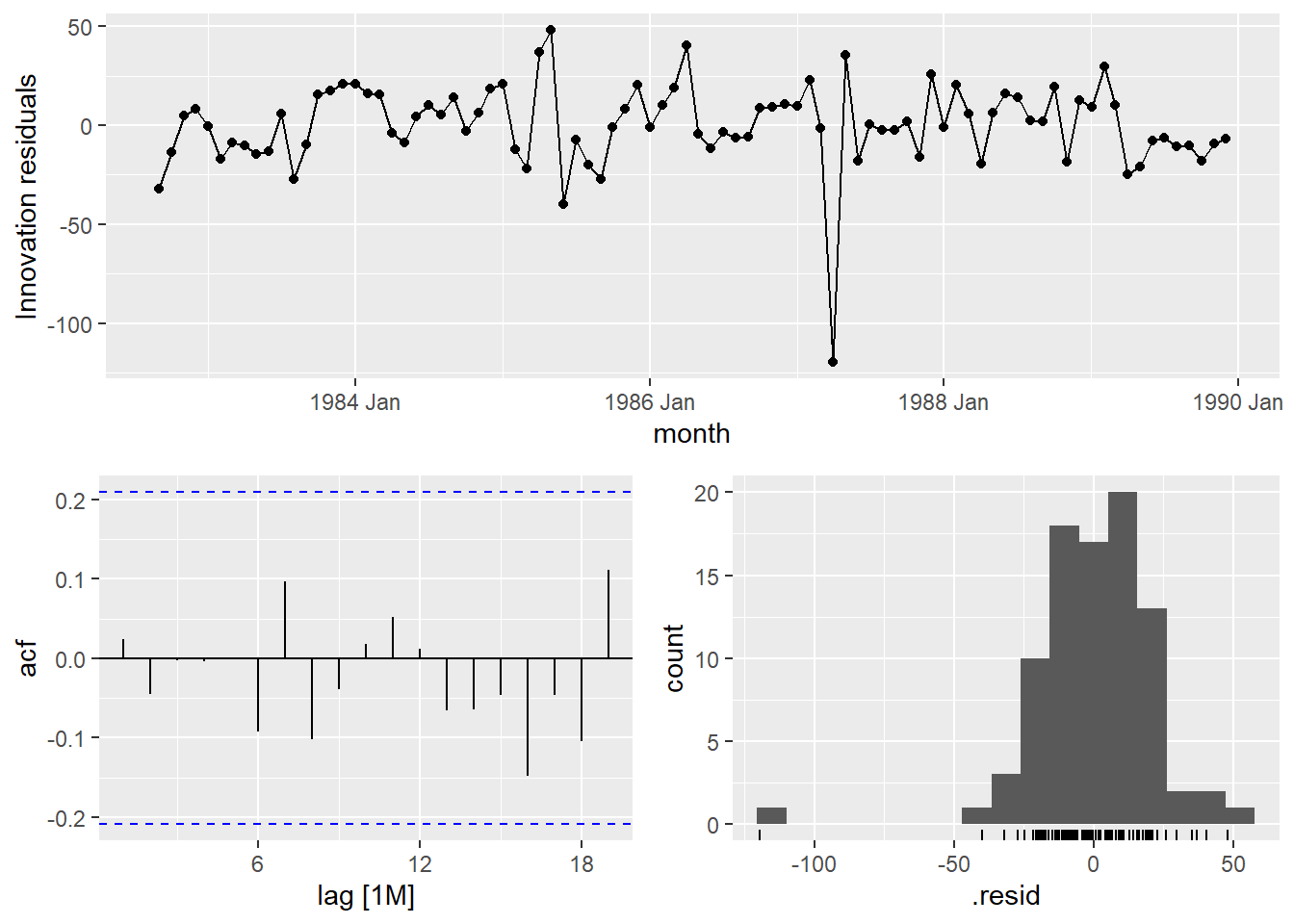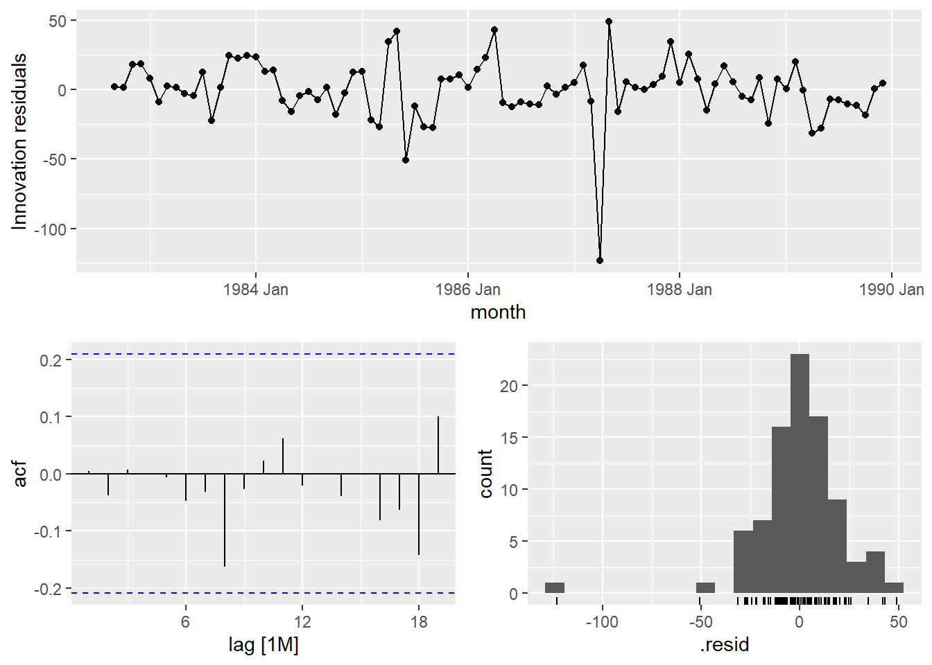 For residuals to exhibit white noise, they must be “independent” and normally distributed with mean 0 and constant variance. You already know how to assess normality and constant variance, however, we need to focus on assessing “independence”. We can assess if there is significant dependence through the Ljung-Box test (or graphically through ACF and PACF plots). The hypotheses being tested are