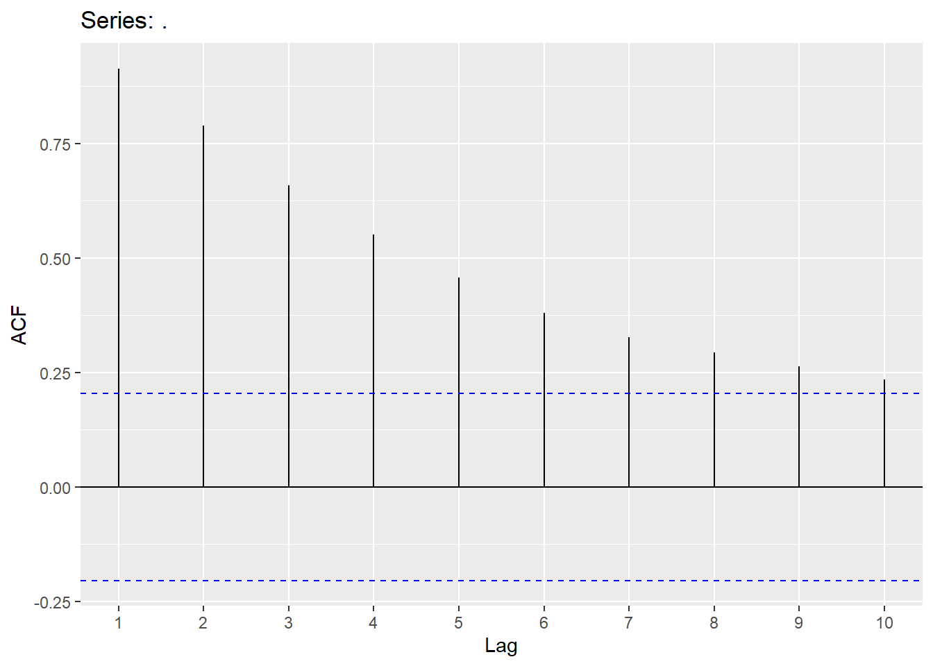 This should be assessed on a stationary time series. Looking at a stationary time series, going back 10 lags should be sufficient (this will be different when we get to seasonal models). Keep in mind that sample size does matter when assessing significance (adjust significance level accordingly).