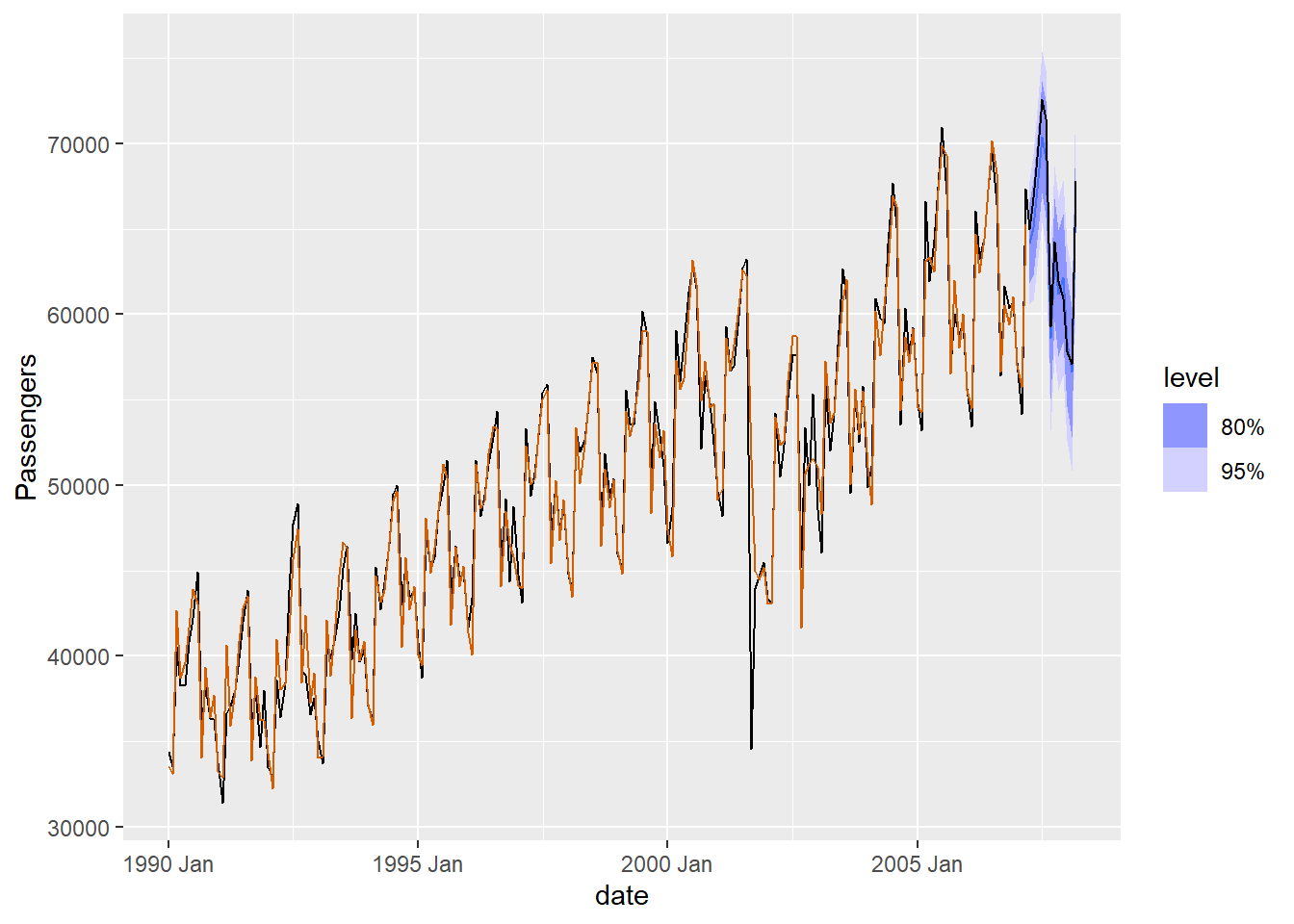 for_newmodel %>% autoplot(USAirlines_ts)+ geom_line(aes(y=.fitted),col="#D55E00",data=augment(new_model))