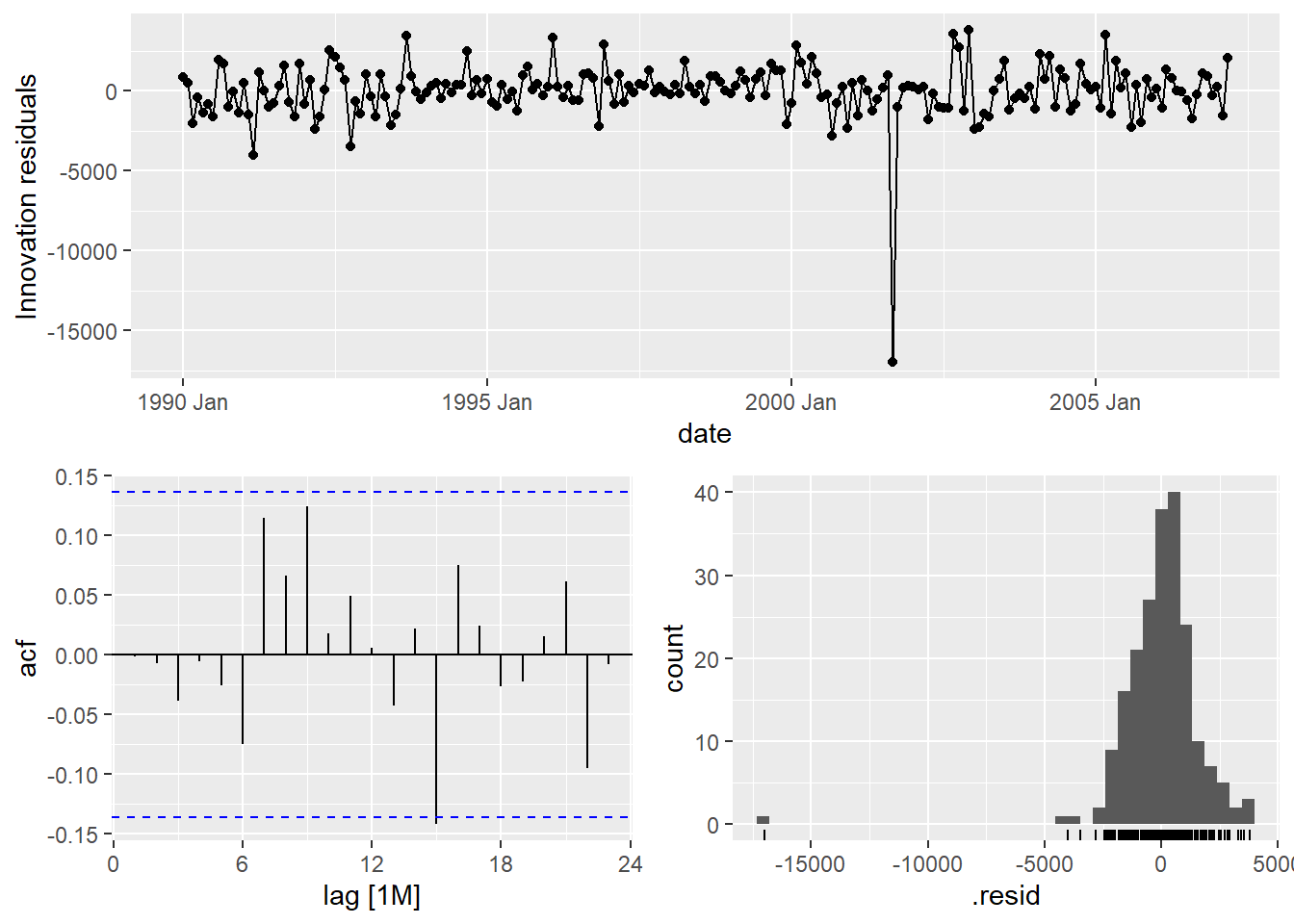 For our dataset we have a step intervention at September, 2001. We can easily create a binary variable that takes a value of 1 after that month and 0 before. By using the formula structure in the ARIMA function in the model function, we can add this intervention to our model as well as build out an automatic seasonal ARIMA. We use the report and gg_tsresiduals() functions to evaluate our model.